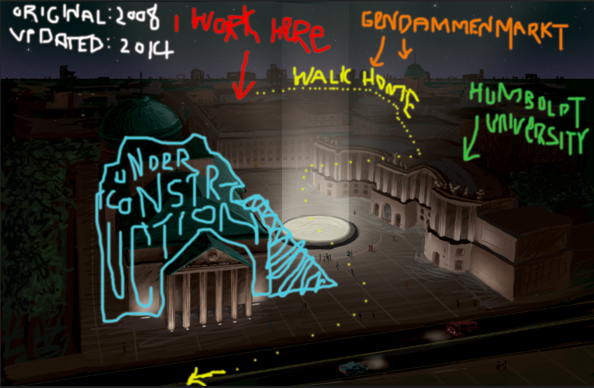 Anyway, I have always been fascinated with the monument that is that square, and had always wanted to see it; it was one of the first landmarks I visited when I arrived earlier this year. Tonight, I remembered that in my fourth and final year in art college, I drew some kind of architectural sketch of it, based on the then-amazing-and-barely-3D Google Maps. I managed to dig it out of my old hard drive, and made a comparative version.